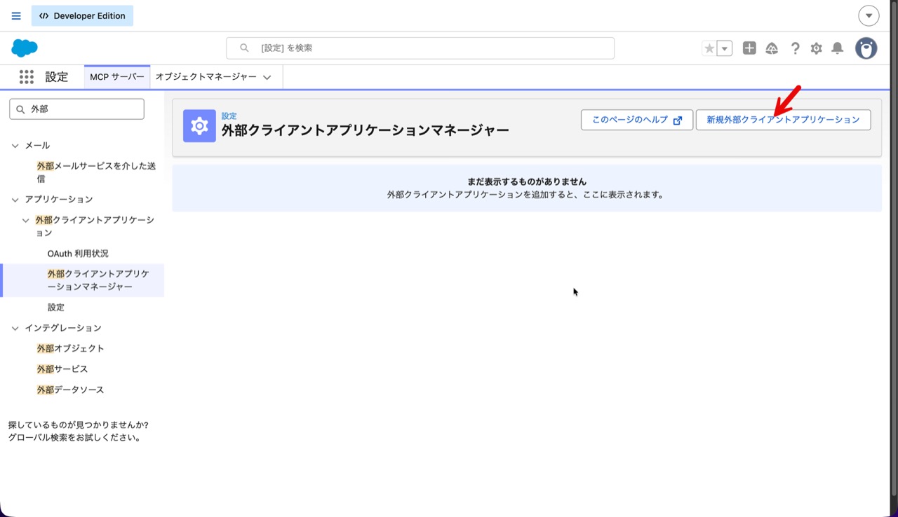 まずは、MCP クライアントからのアクセスを Salesforce で認証・認可できるように外部クライアントアプリケーションを作成します。